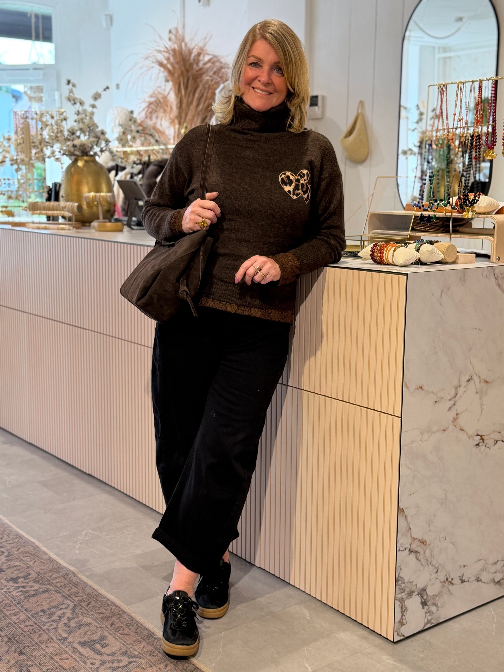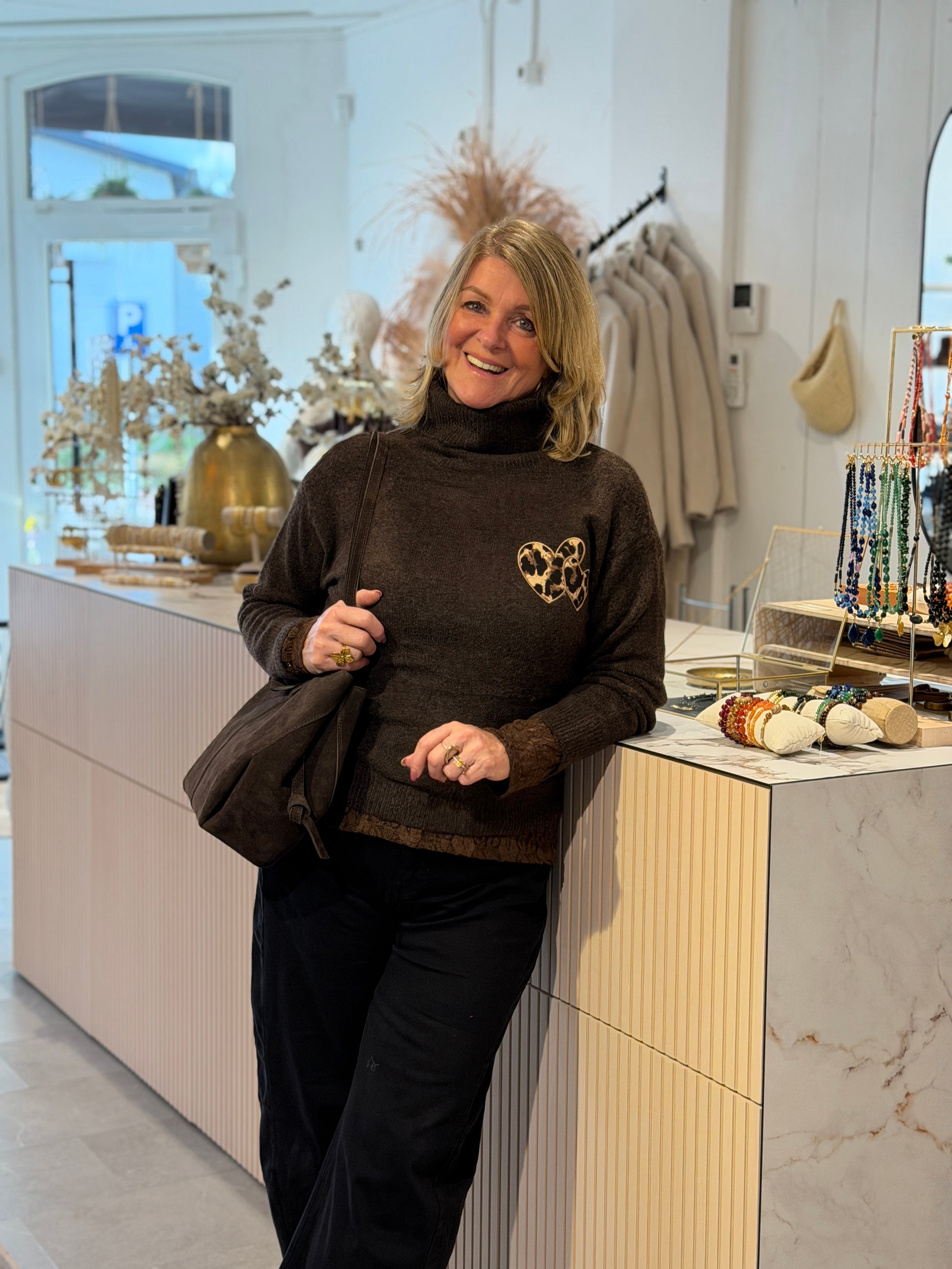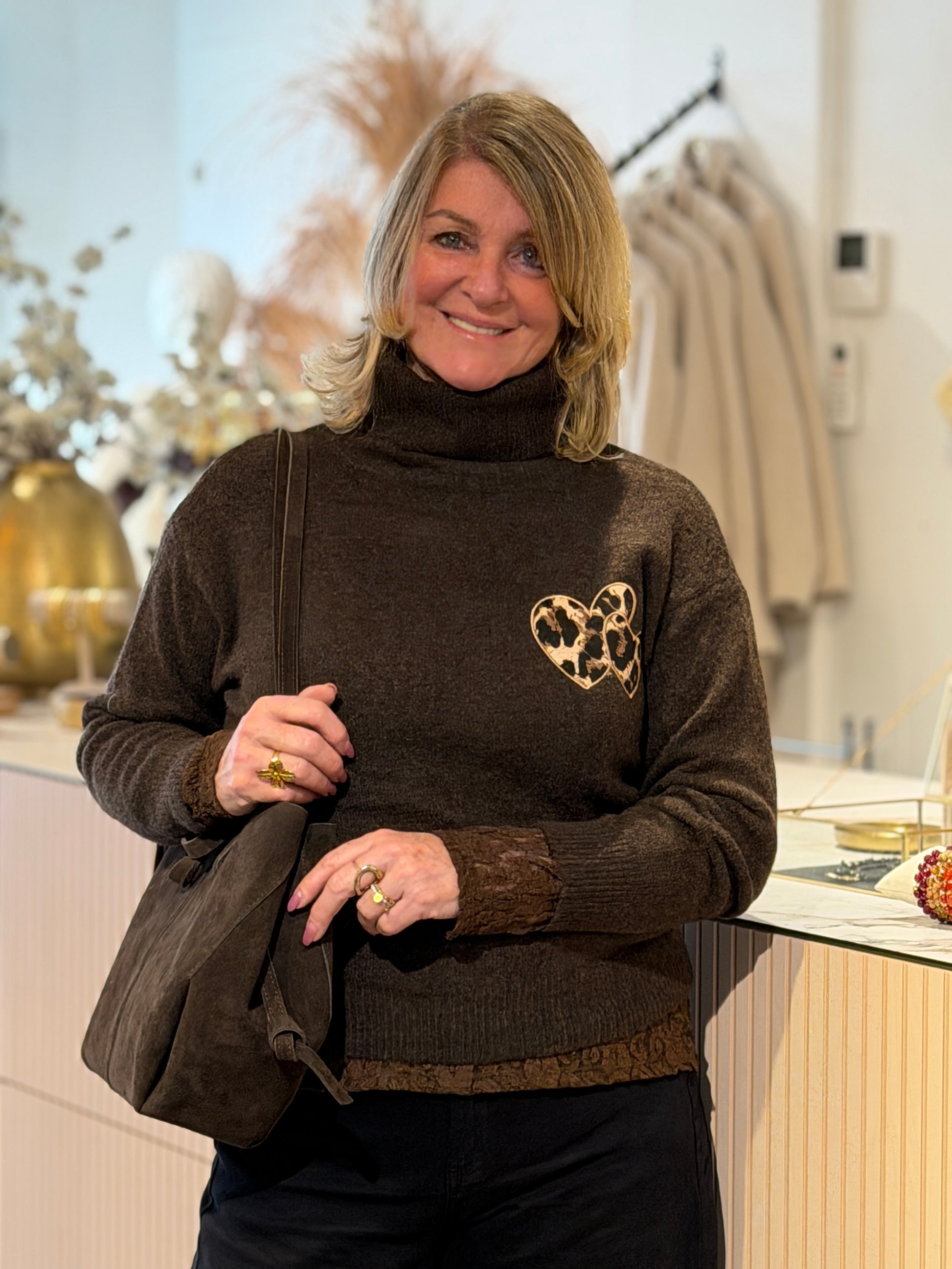 Hele leuke trui met aparte details. Trui heeft aan de achterkant een split met aan de onderkant 2 panter knoopjes.