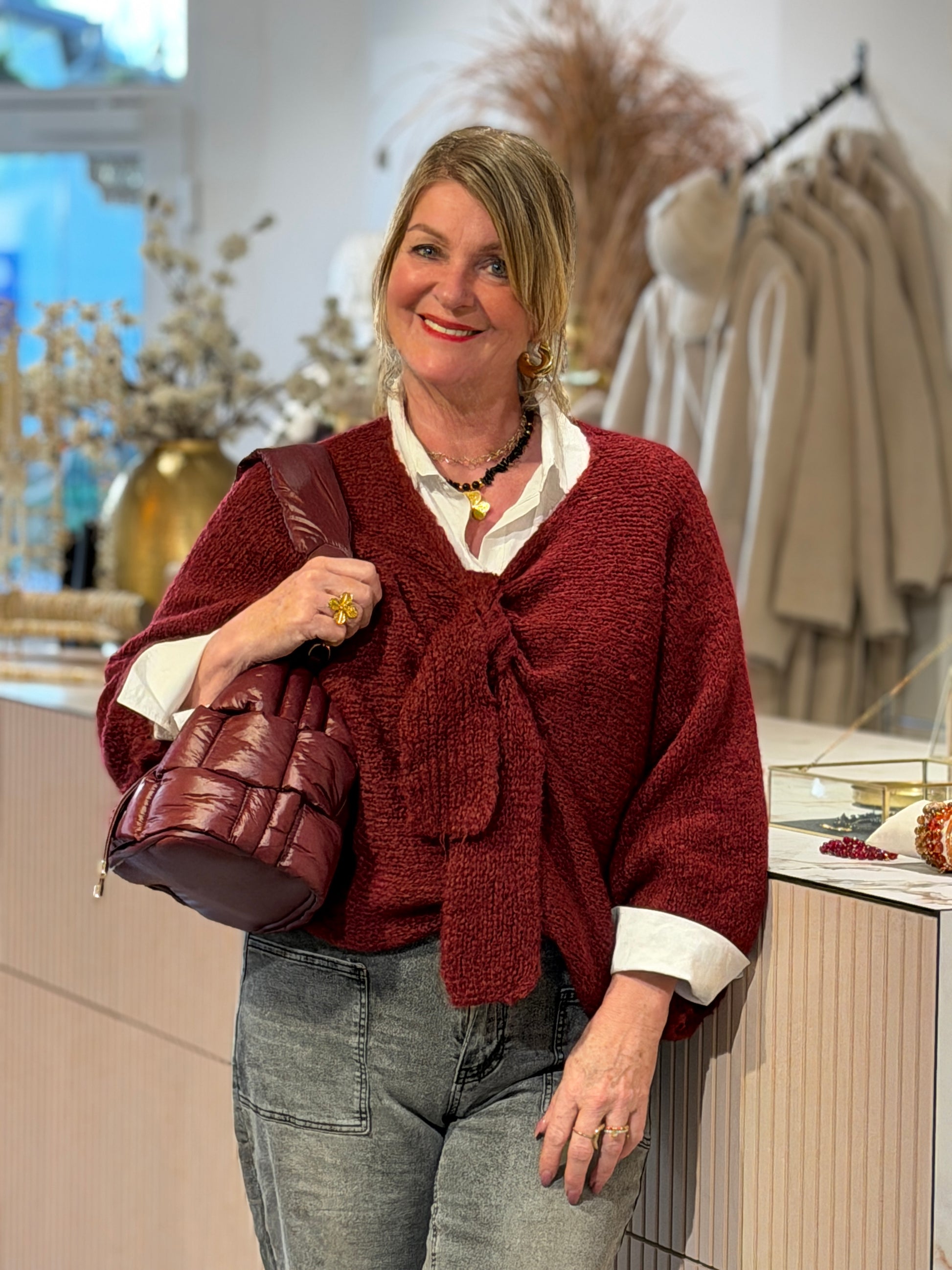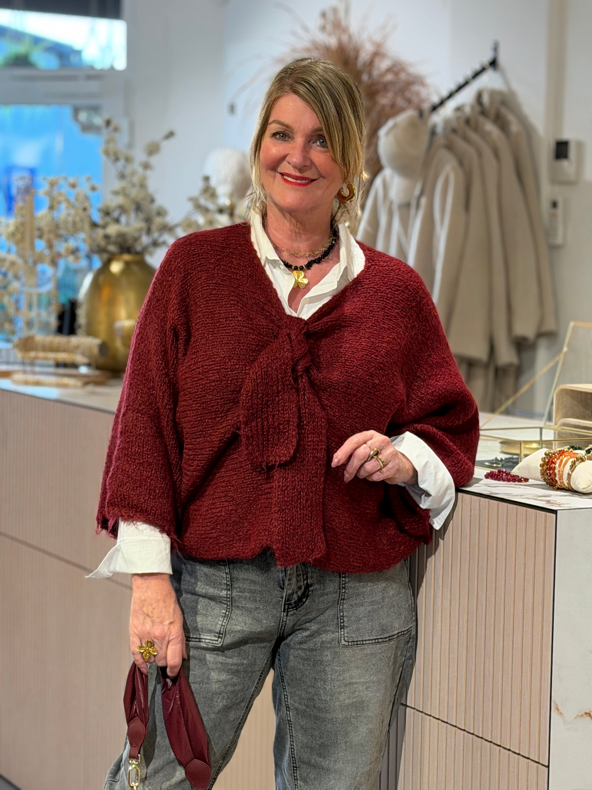 Super gave trui met aan de voorkant een strik die je naar wens kunt strikken 0f knopen.