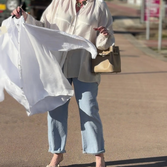 Mooie langere glanzende satijnen blouse met leuk effect op de mouwen en aparte knoopjes aan de voorkant.
