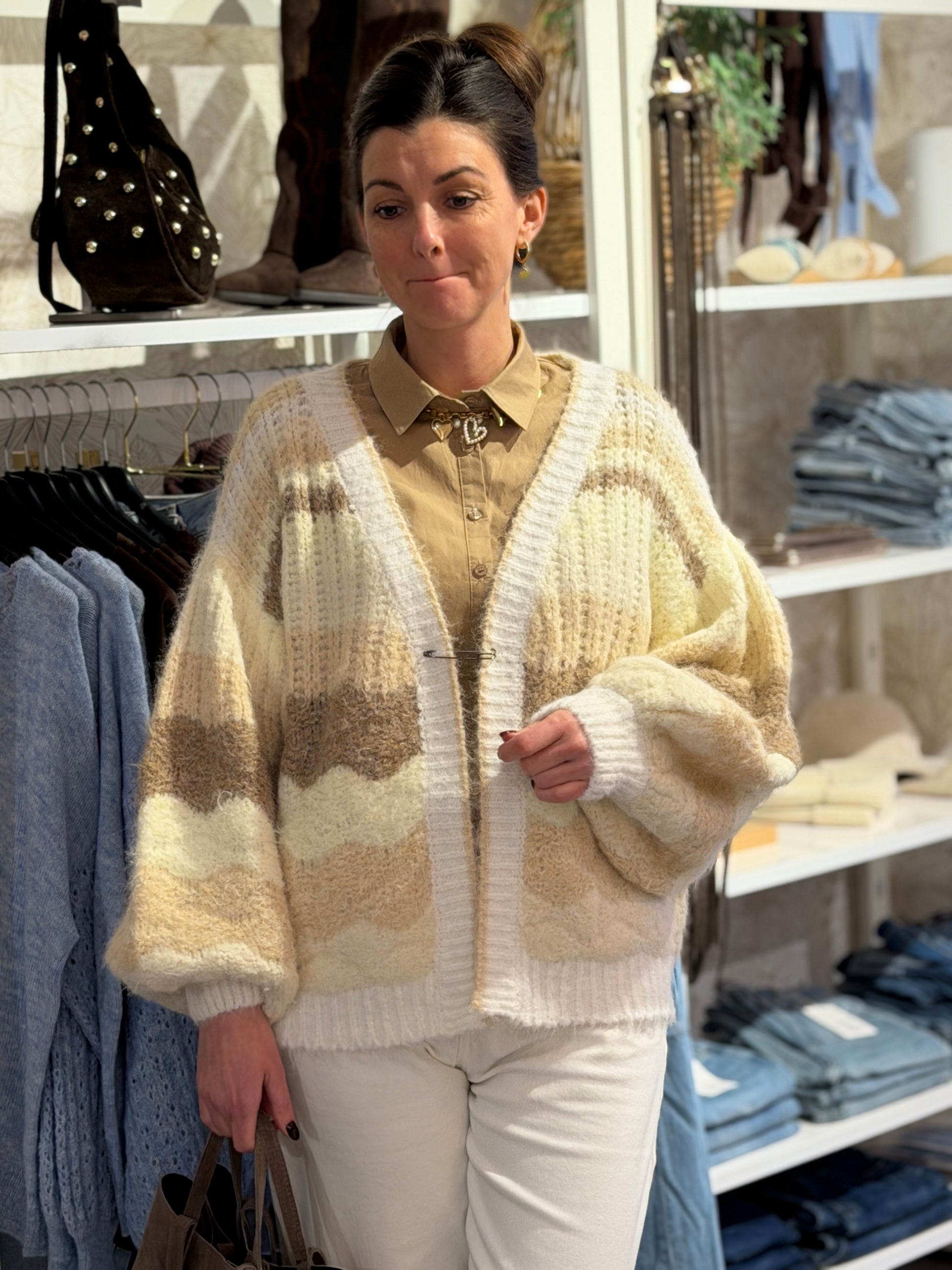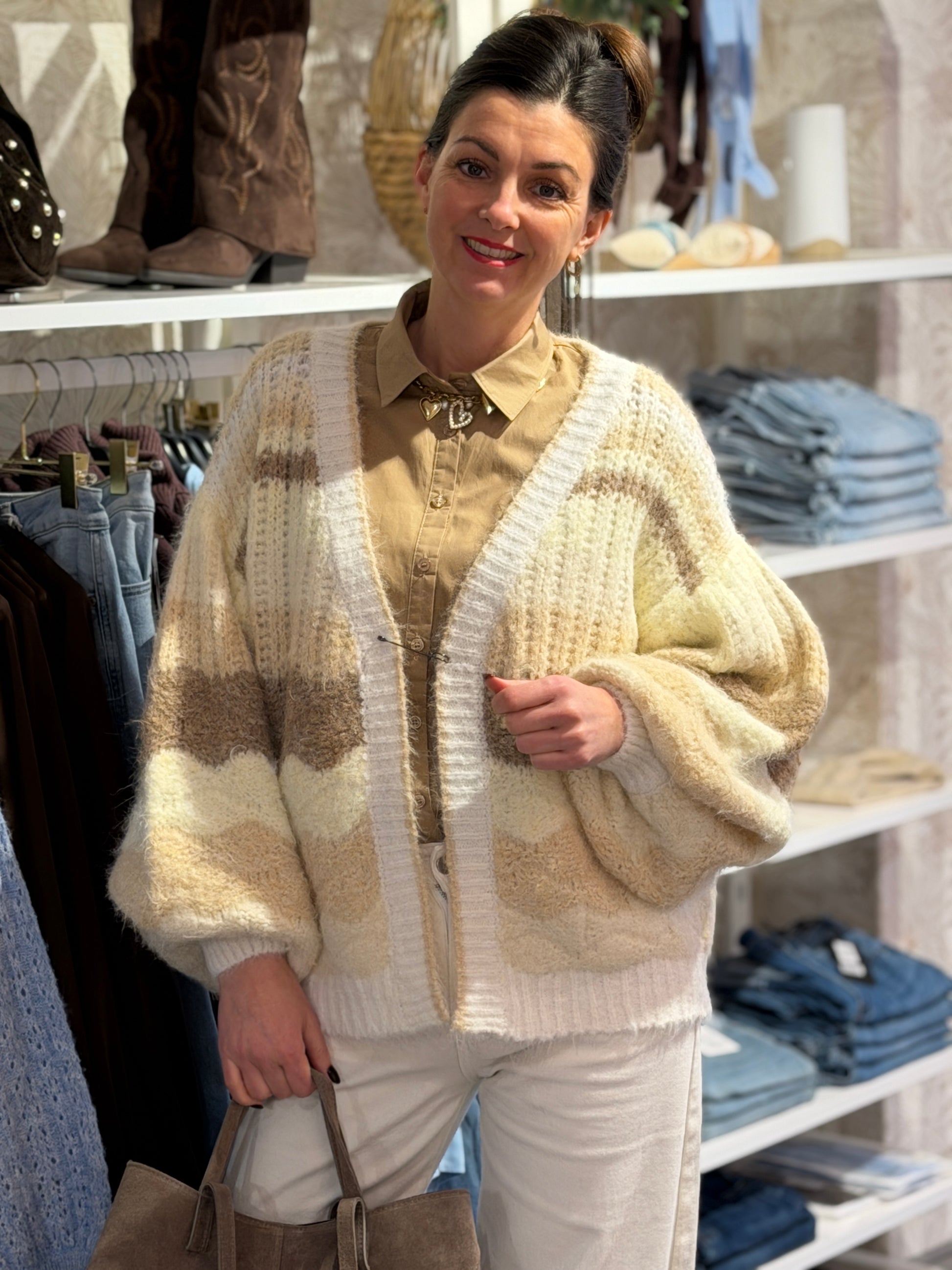 Heerlijke zacht vest met streeppatroon in natuurtinten.