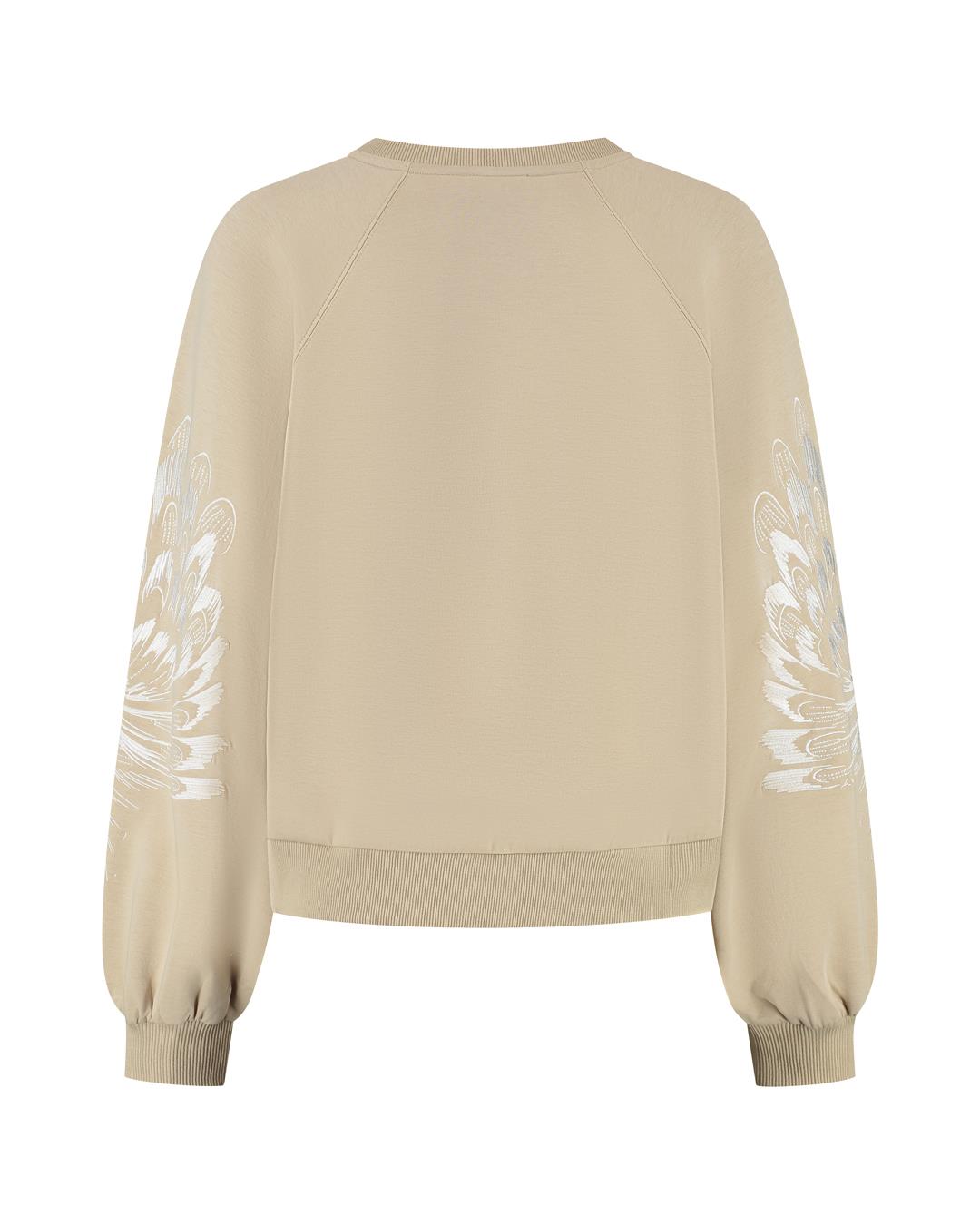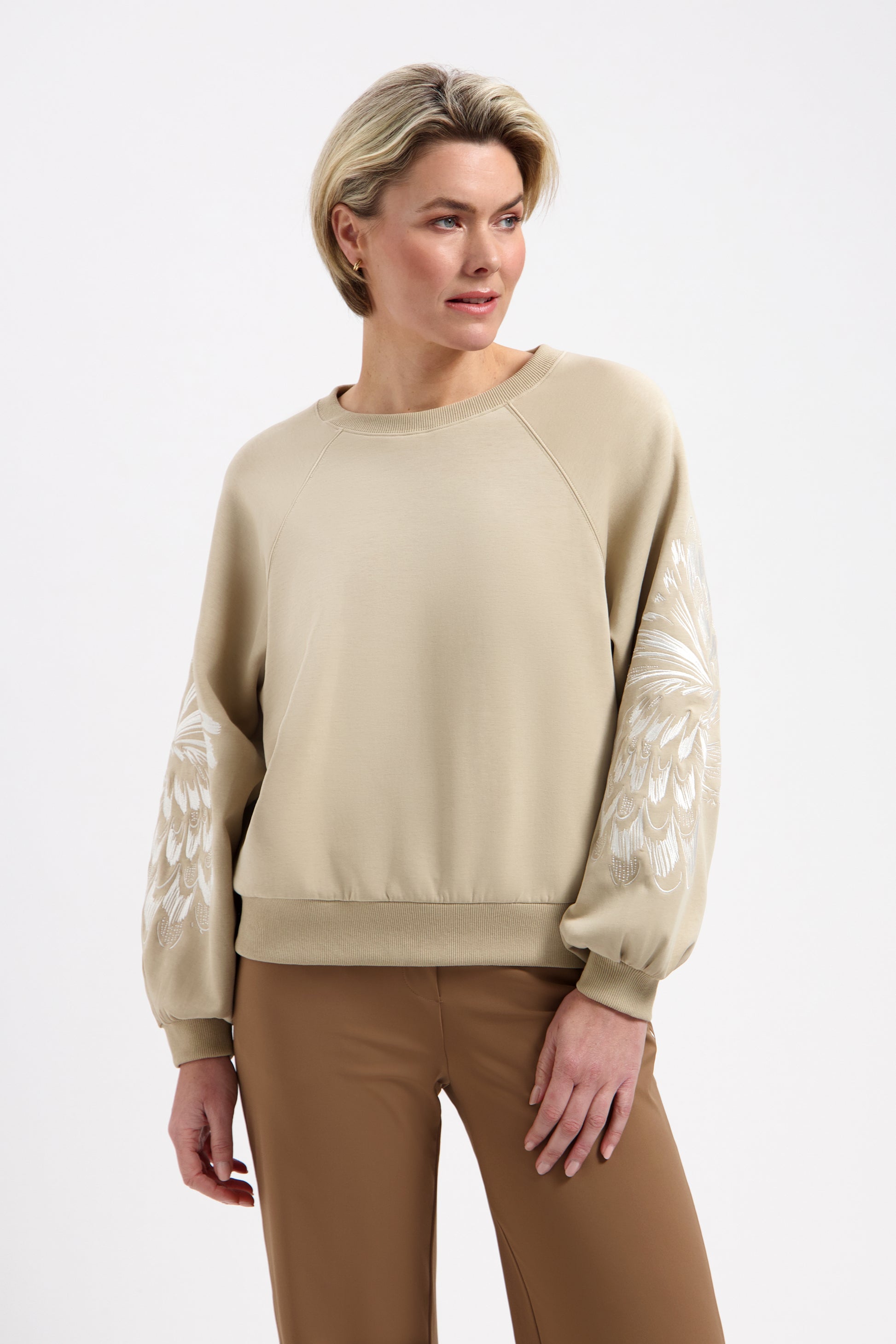 De trui Coby is een wat ruimer vallende trui met ronde hals en wijd uitlopende mouwen. Op beide mouwen zit een mooi borduursel.