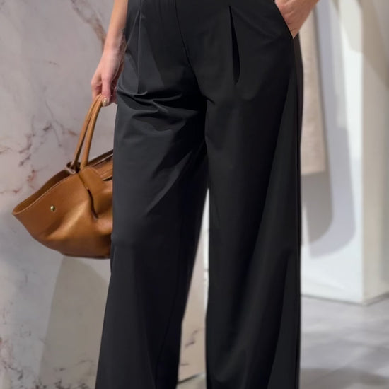 The Phoenix trousers are straight trousers that flare slightly at the bottom. The back of the waistband has elastic and belt loops all around. The item has side pockets at the front and piped pockets at the back.