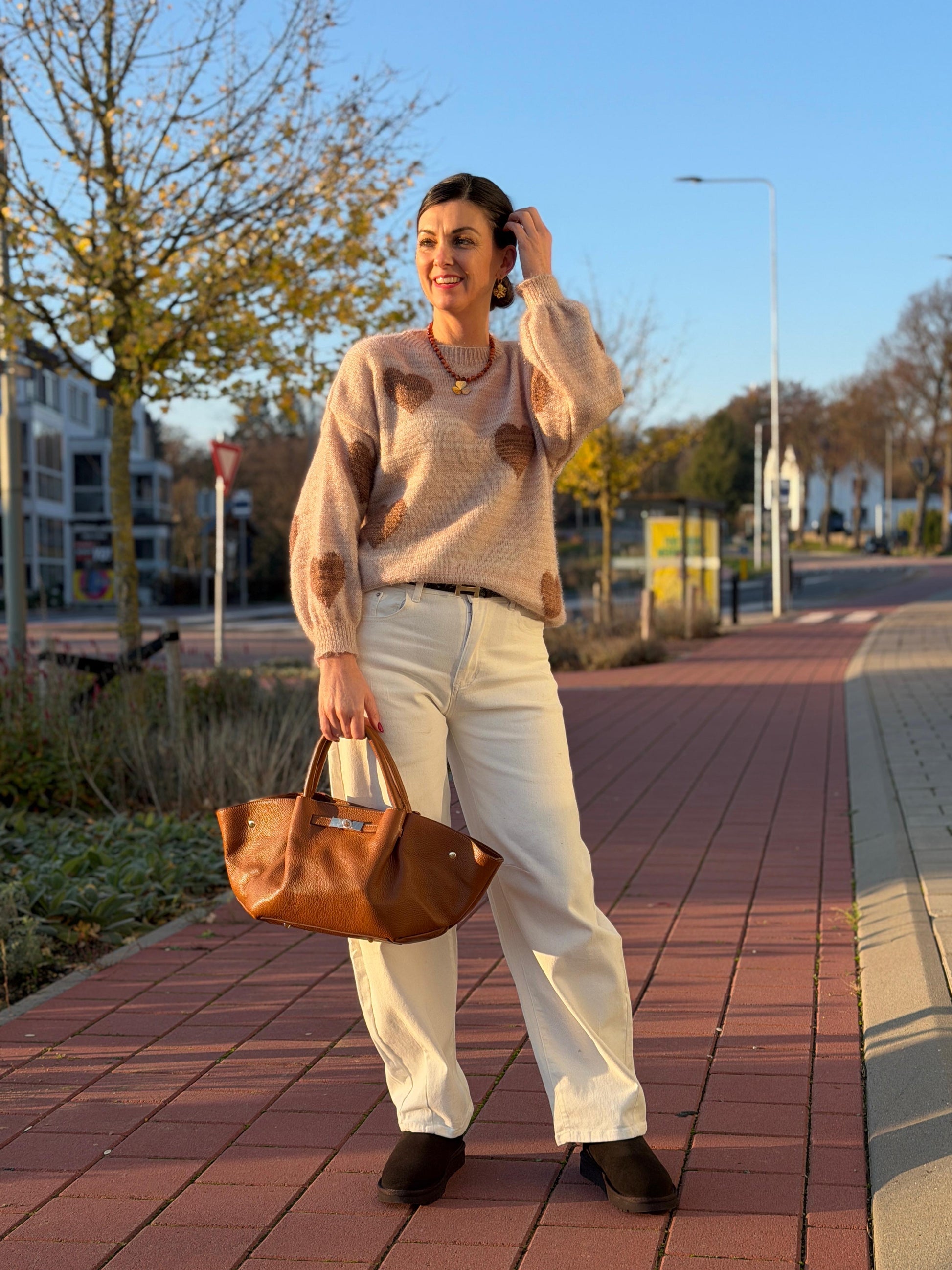 Een super zachte trui met een speels patroon van beige hartjes. De trui heeft een ronde hals. kriebelt niet ;-)