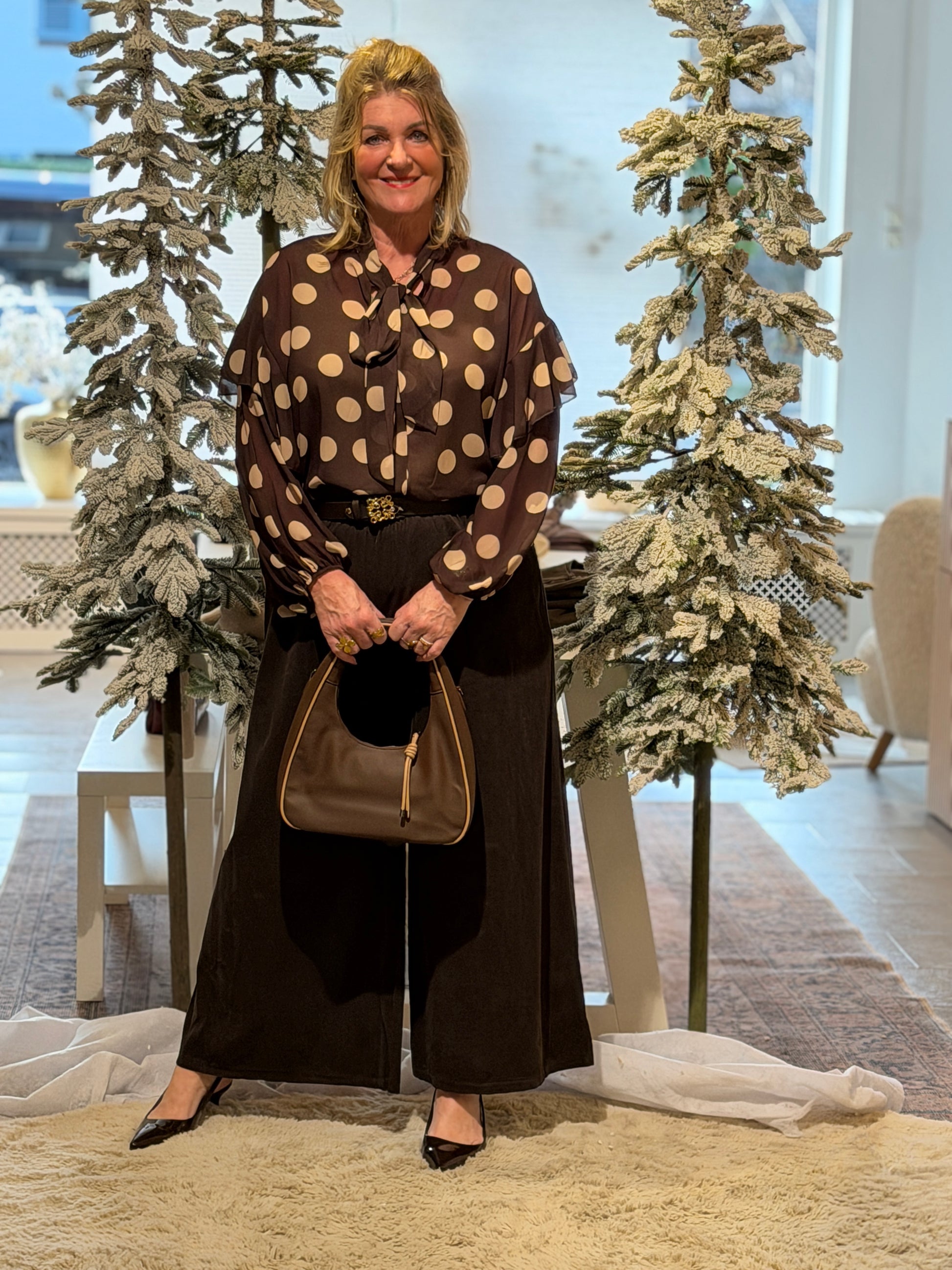 Luchtige polkadot blouse met ballonmouwen en strijkdetail aan de hals. Stijlvol, speels en makkelijk te combineren.