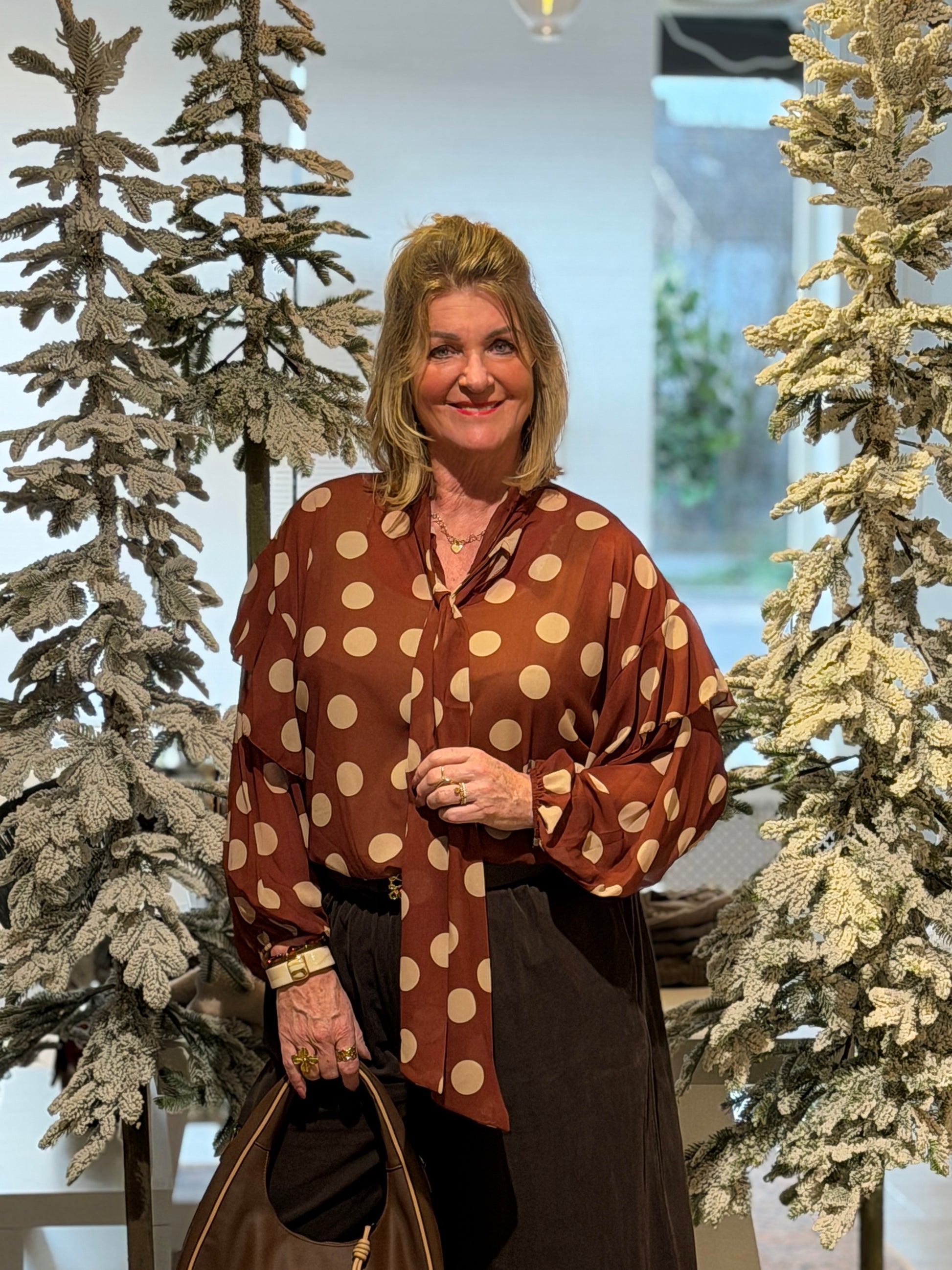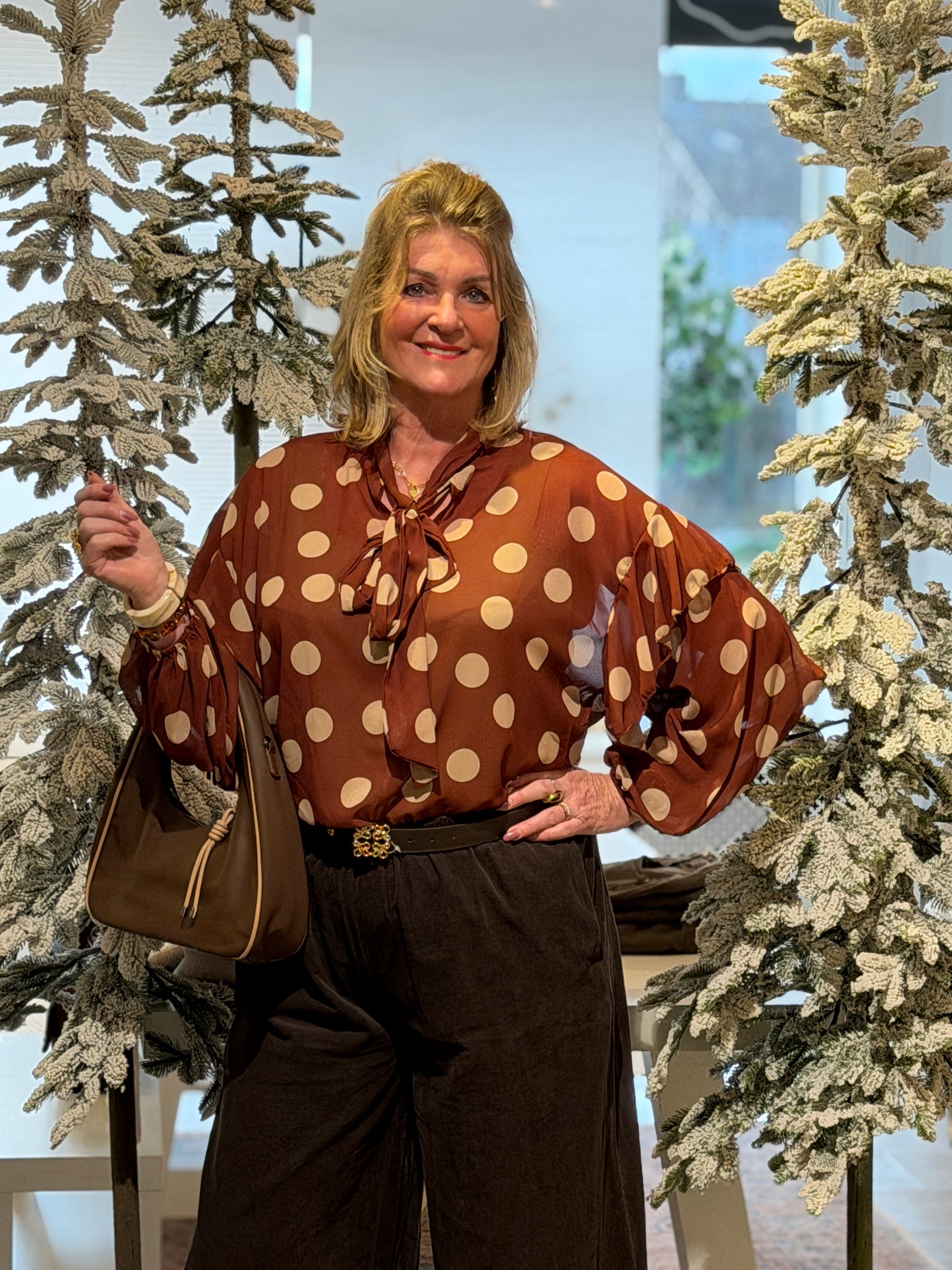 Luchtige polkadot blouse met ballonmouwen en strijkdetail aan de hals. Stijlvol, speels en makkelijk te combineren.