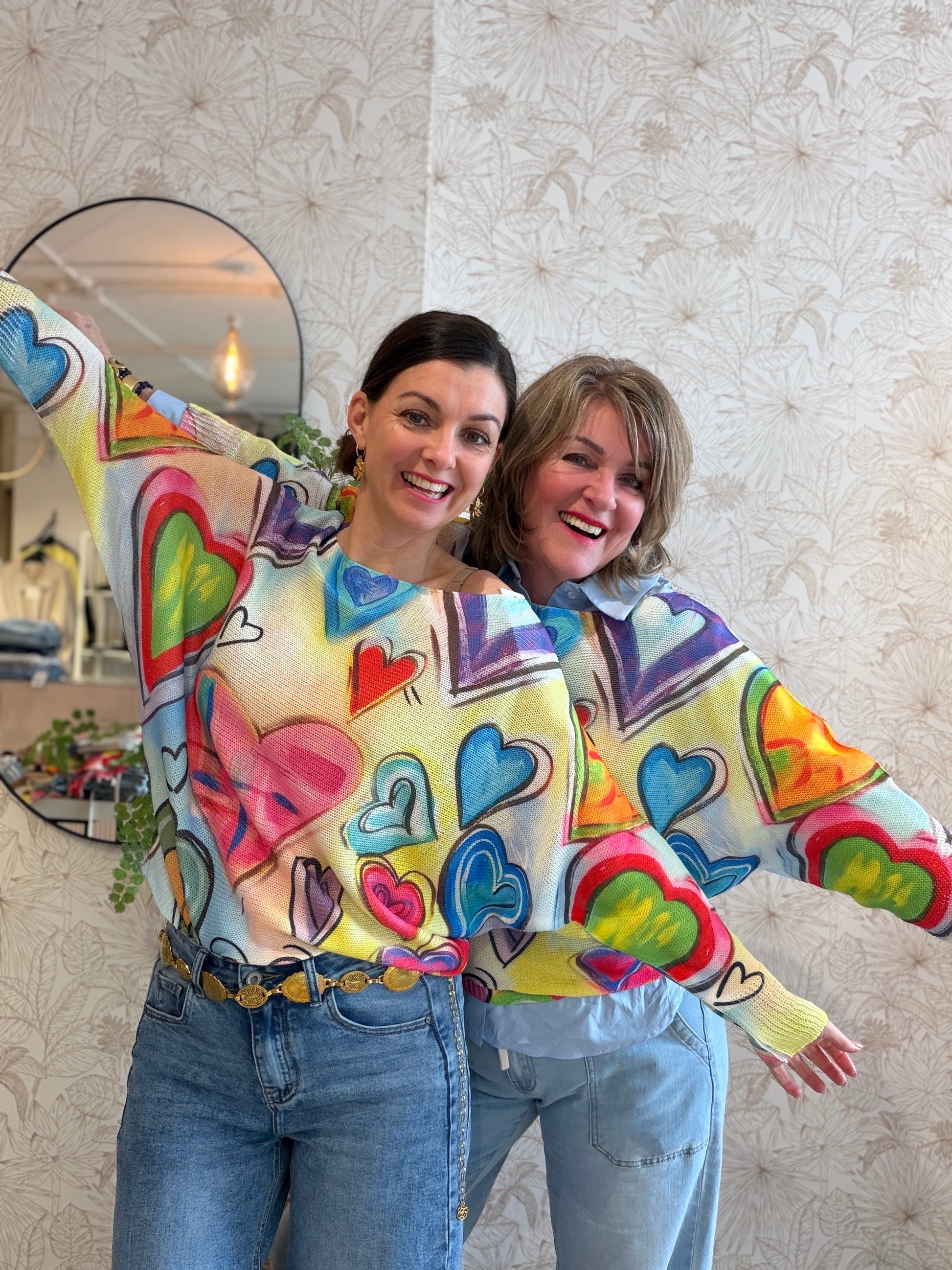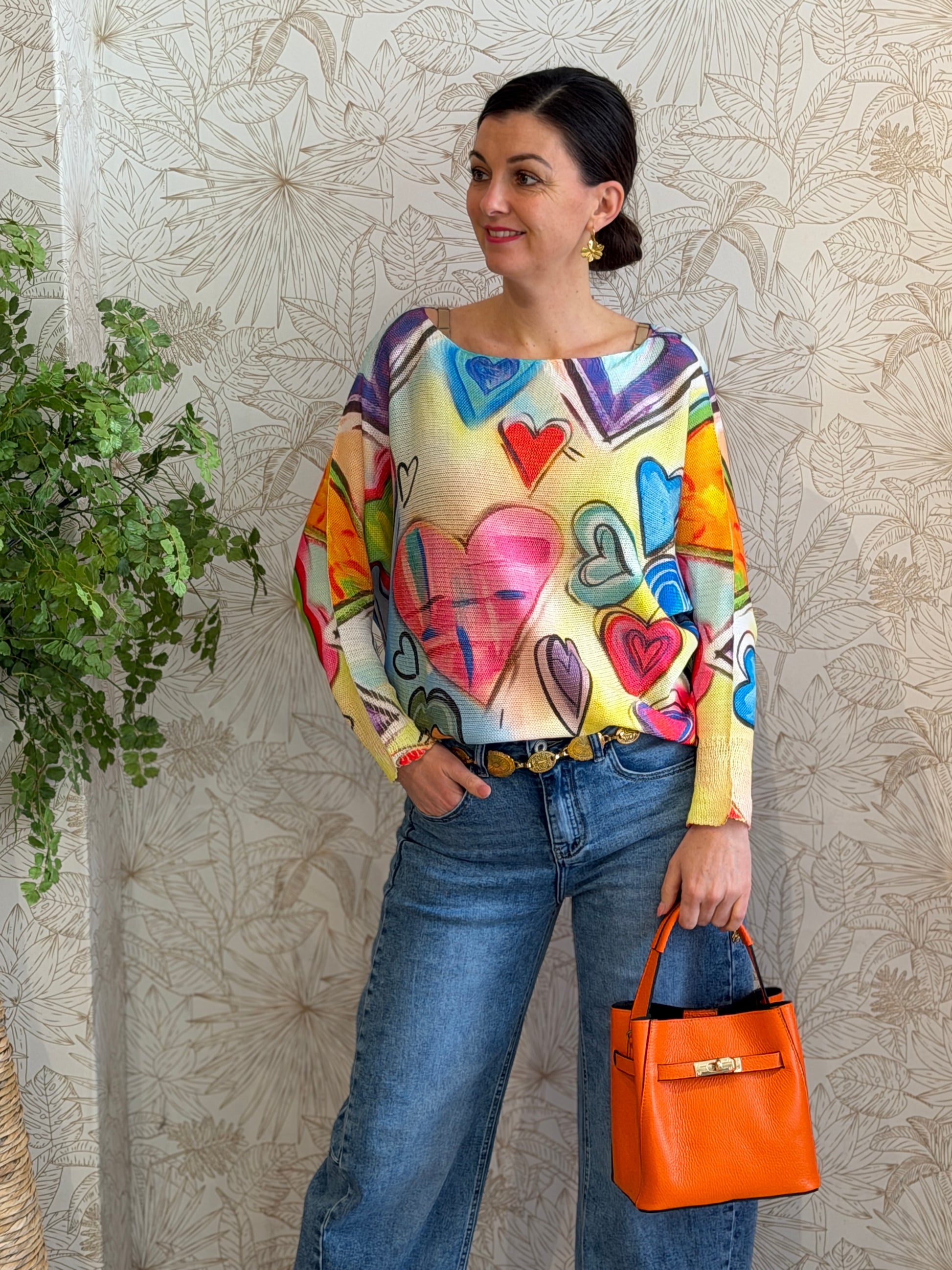 Wat een fleurige trui. trui is dunner van stof dus lekker door te dragen. Vleermuis mouwen en een boothals.