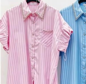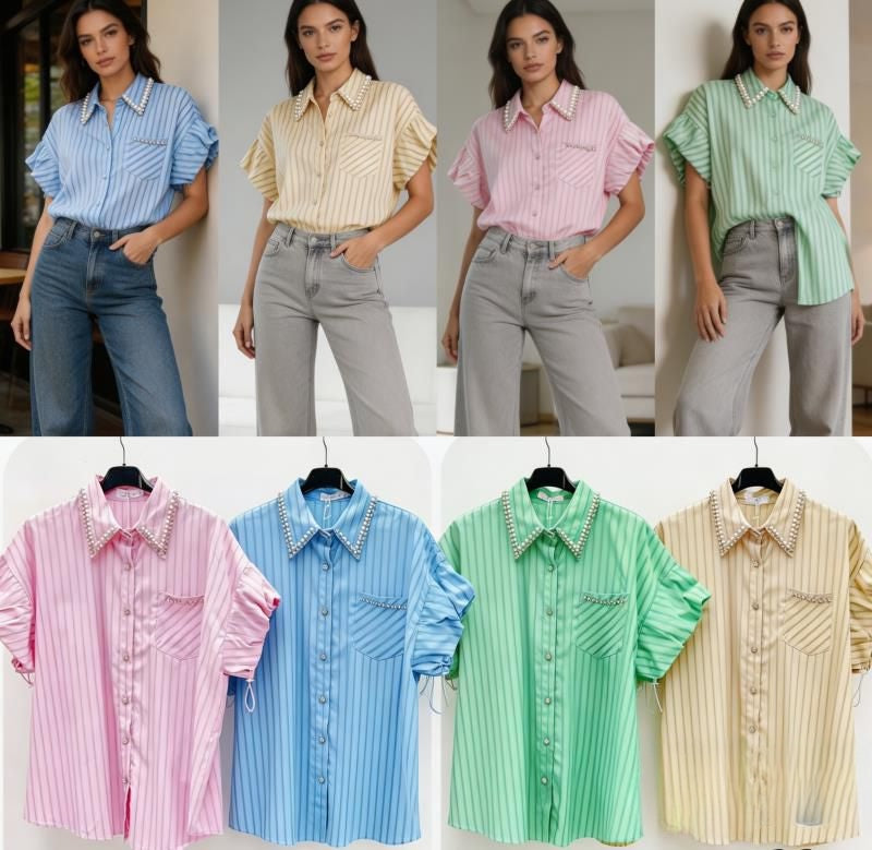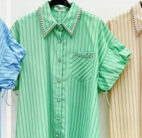 Te Gekke blouse in 4 kleuren. Steentjes aan de kraag en de pofmouwen kan je naar wens aantrekken dmv een koord
