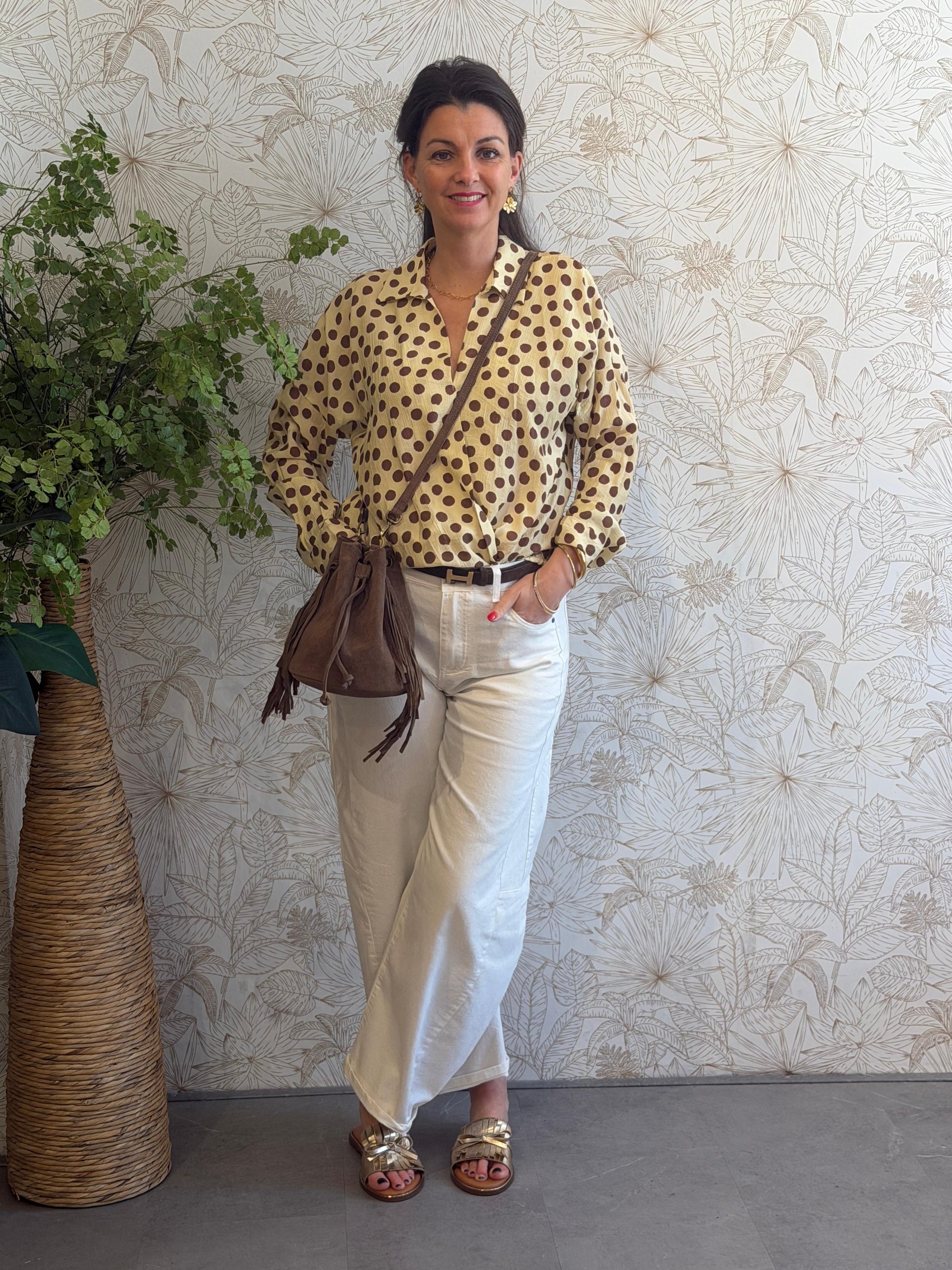De DOTS Blouse is een overslagblouse met stippenprint. Leuk te stylen op verschillende manieren.