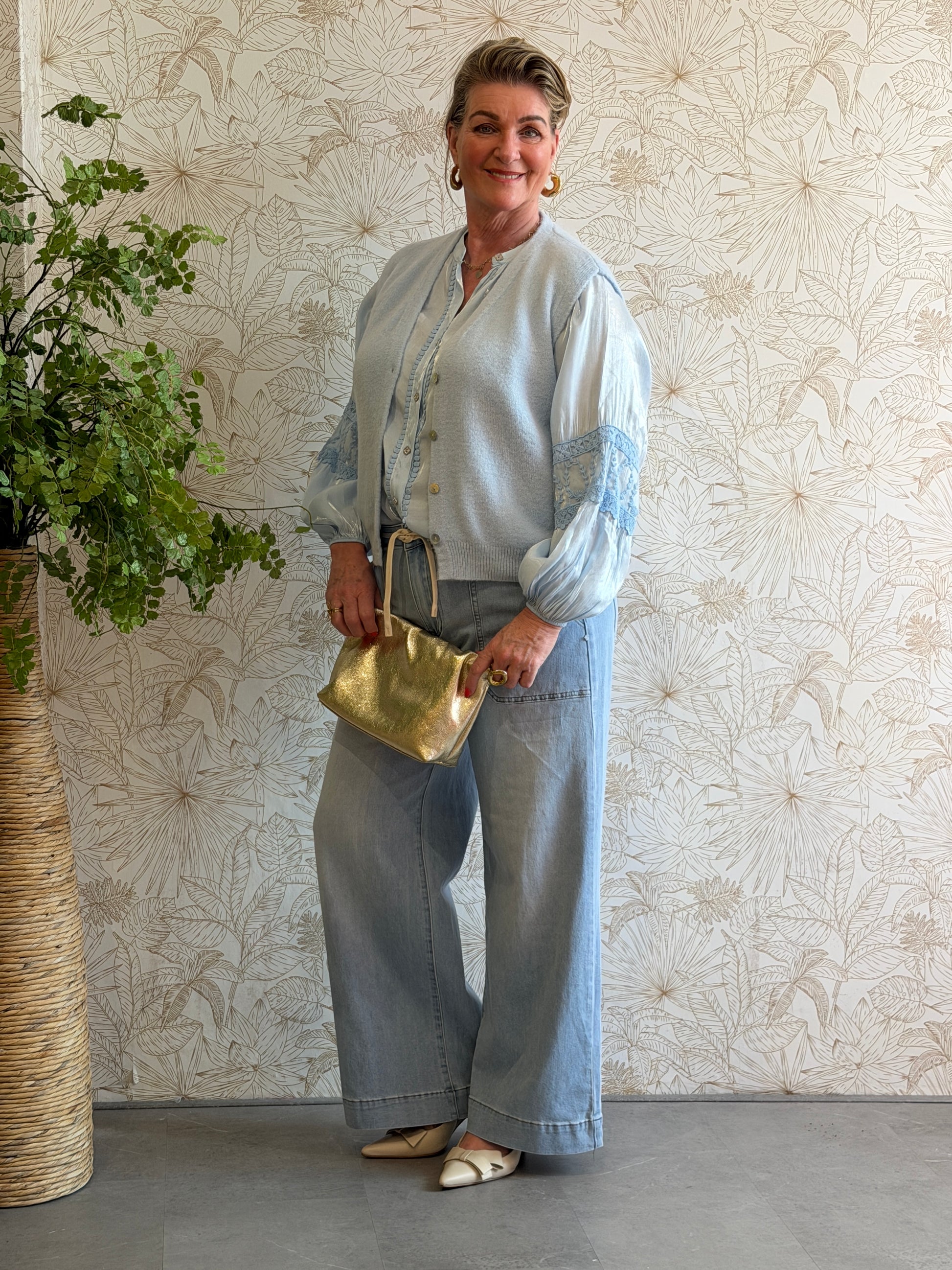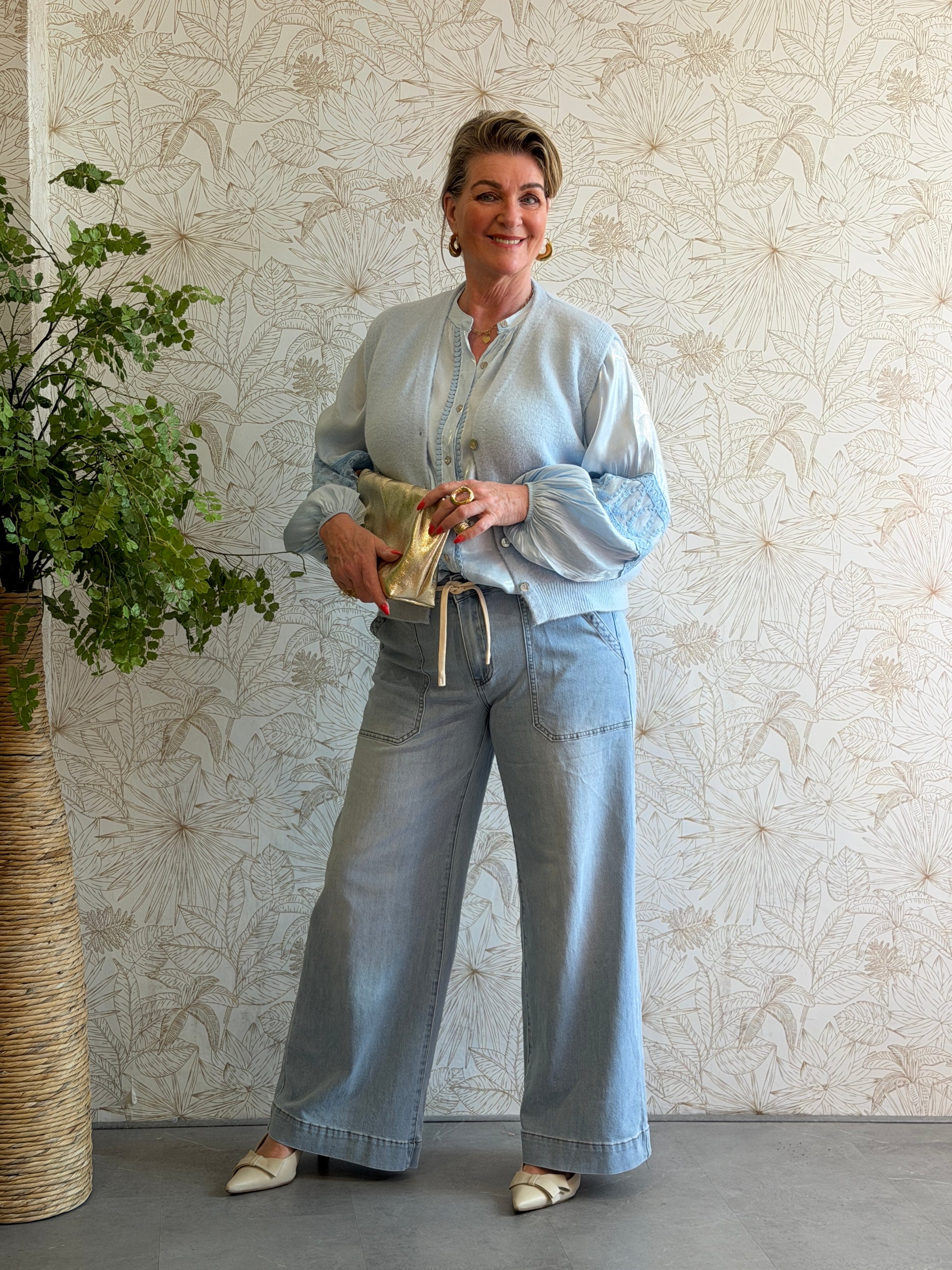 Mooie langere glanzende satijnen blouse met leuk effect op de mouwen en aparte knoopjes aan de voorkant. Leuk gecombineerd met onze bijpassende spencer.