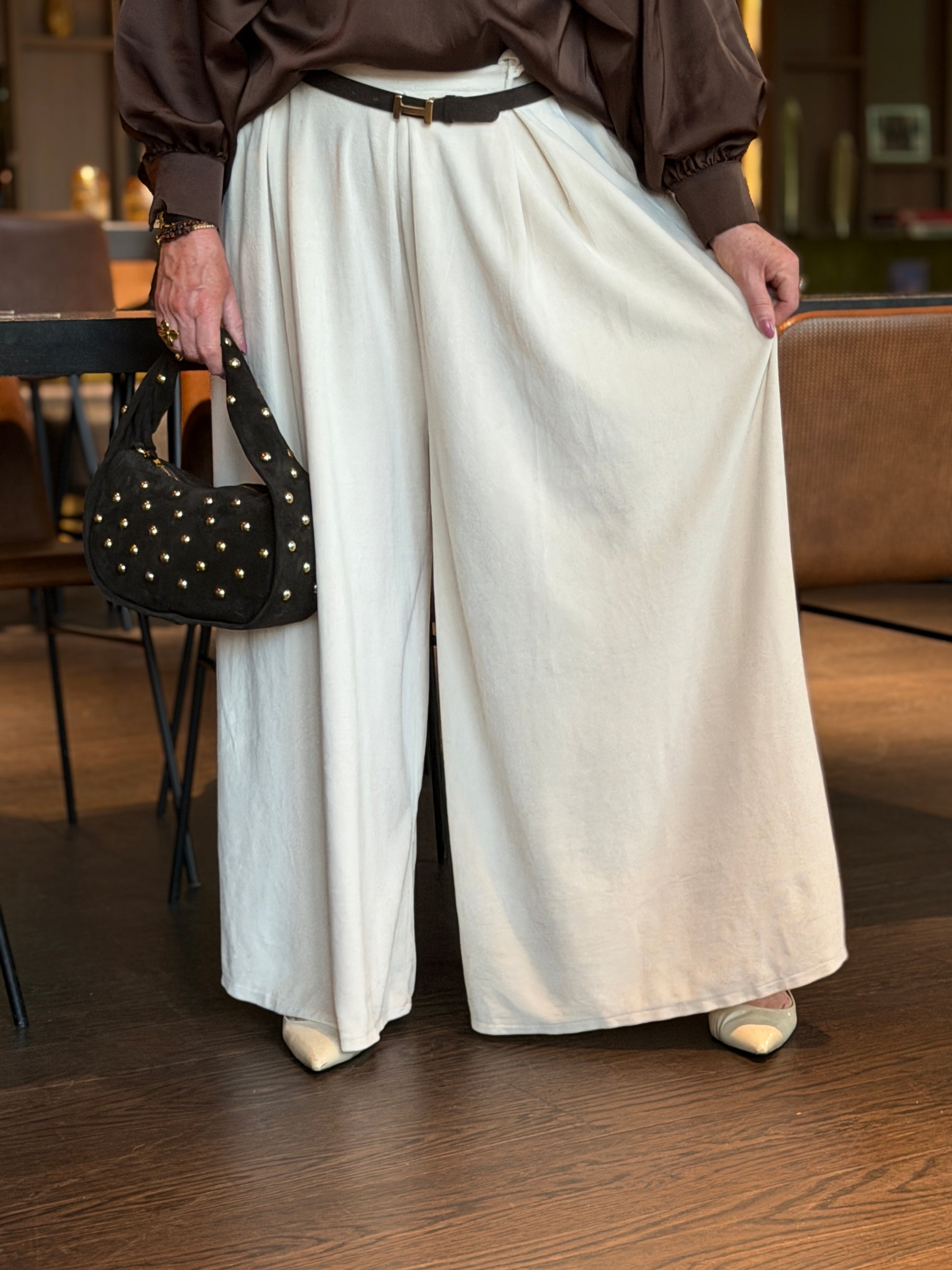 Deze wijde broek geeft elke outfit een stijlvolle, warme uitstraling. De broek heeft een elastieke band met ceintuur.