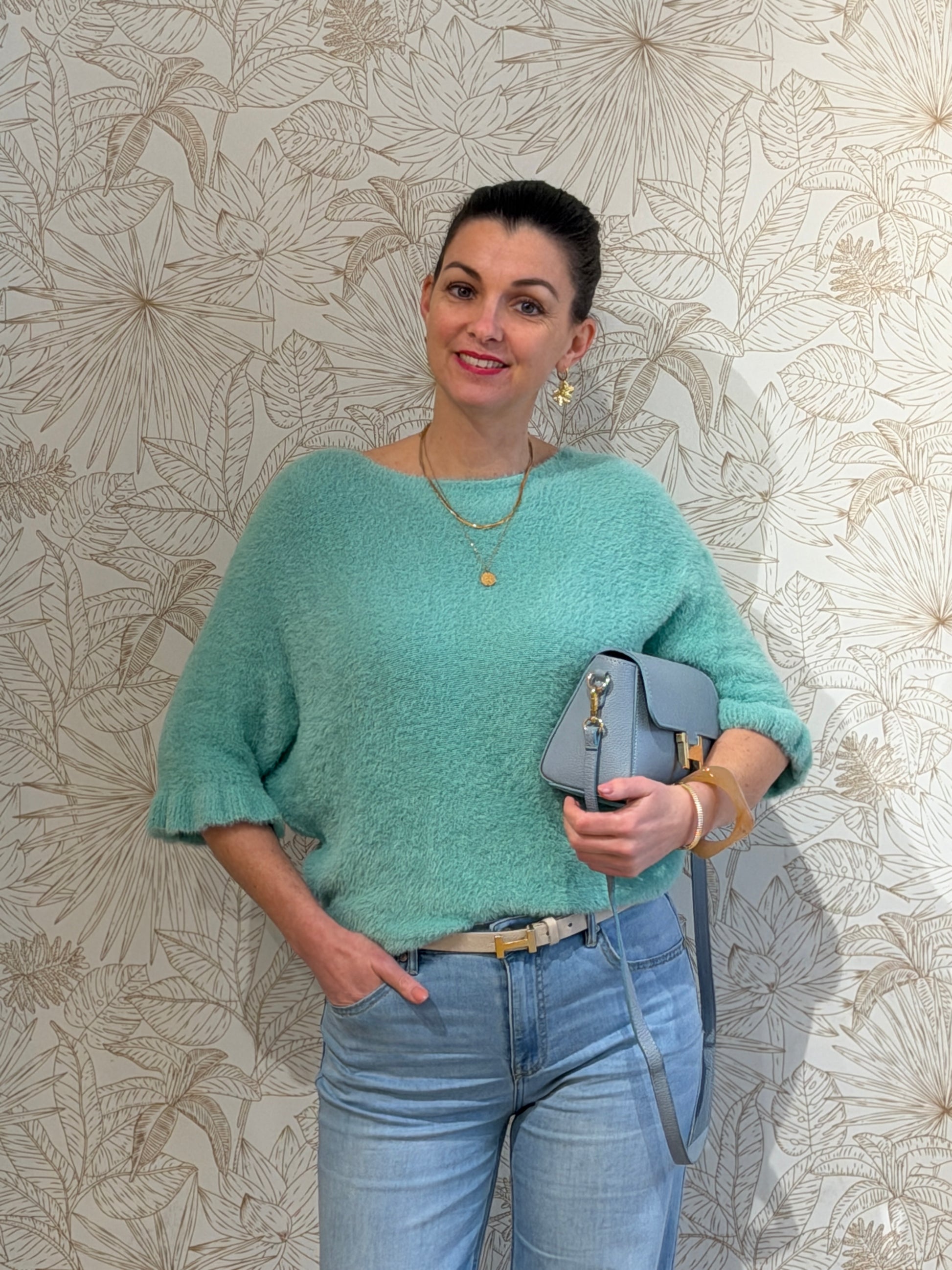 Een super zachte, warme trui met heel veel stretch die meteen dat knusse winter gevoel geeft. Leuke mouwen met ruffle.