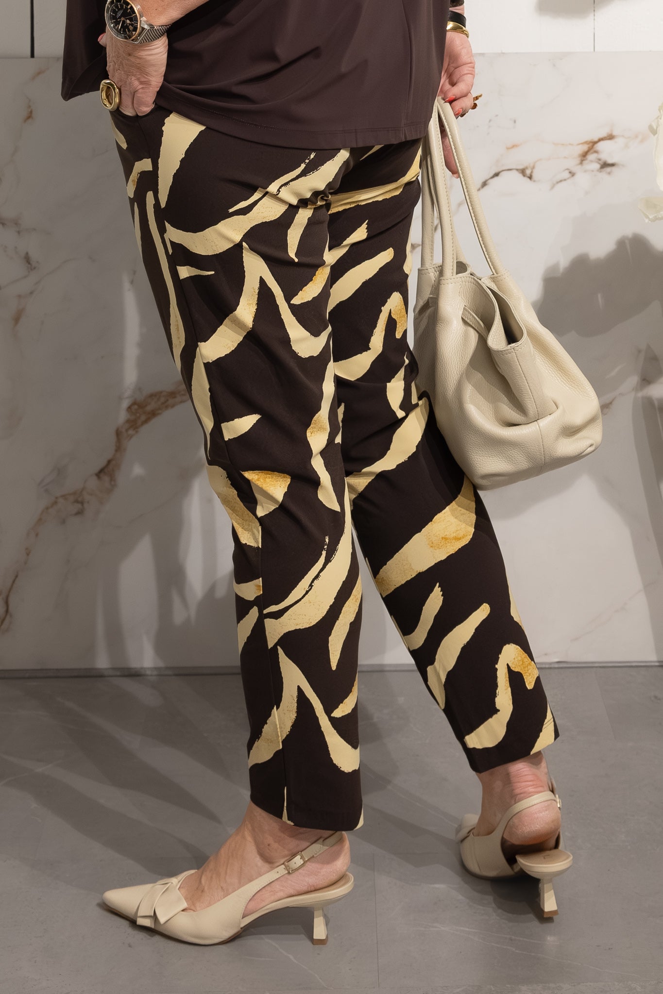 Elegante 7/8 broek in een opvallende pania print gemaakt van comfortabele travelstof. Stretchy, ademend en perfect voor een stijlvolle en moeiteloze look.